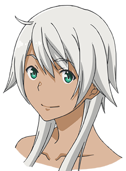 Akane is a light brown-skinned young woman with light grey hair that reaches shortly below her shoulders and green eyes.